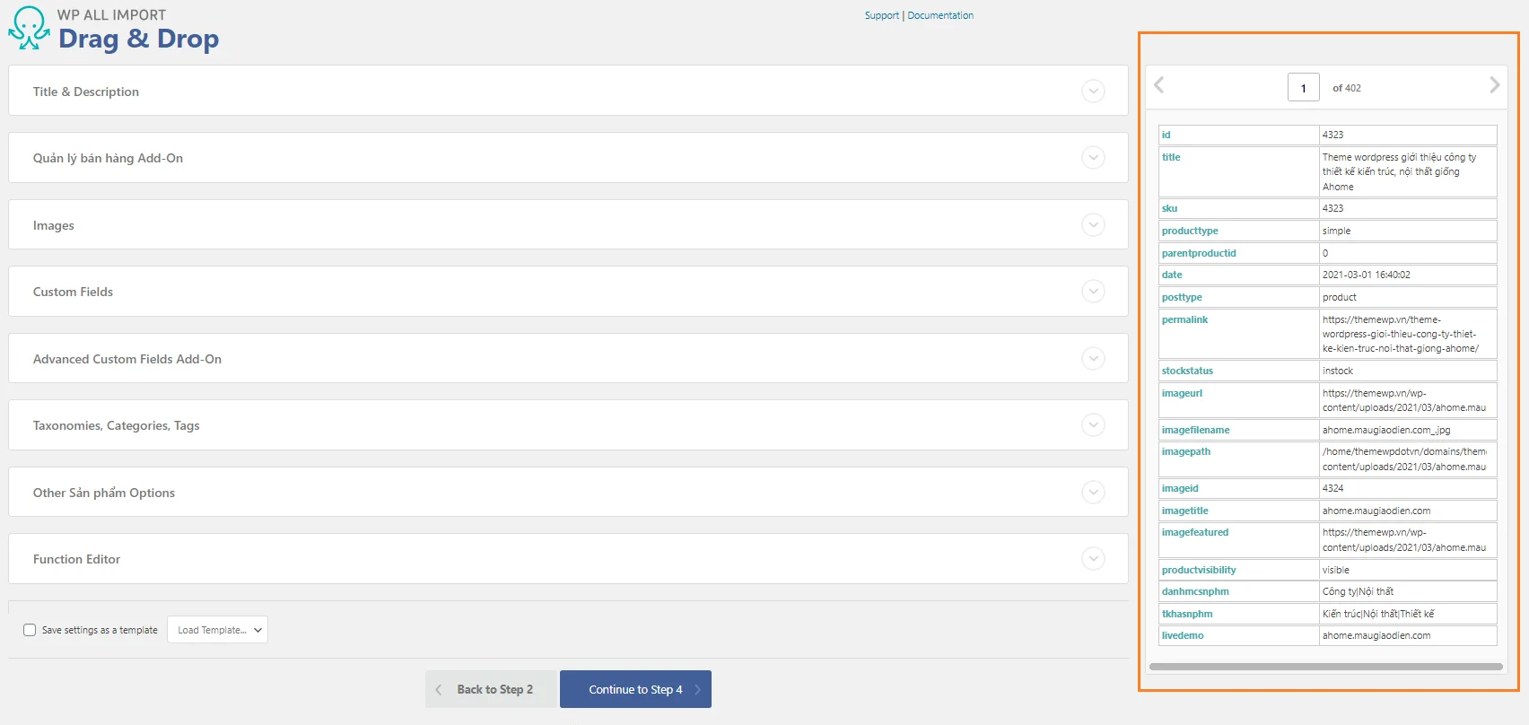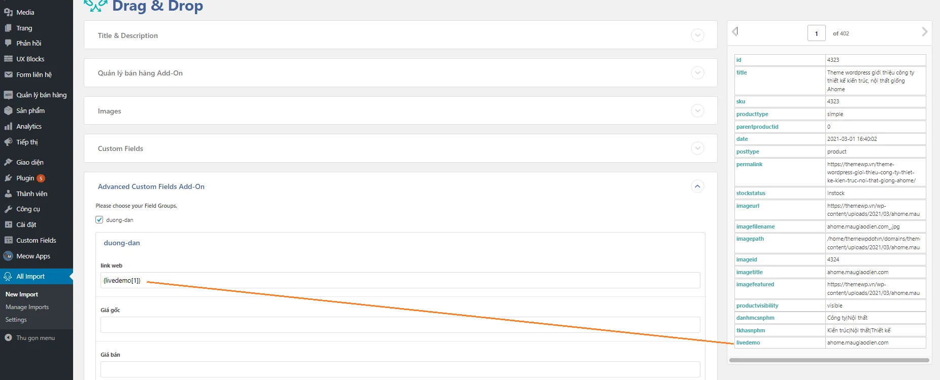 Ví dụ này Themewp.vn sẽ hướng dẫn bạn nhập dữ liệu đã được export ra từ wocoommer bằng WP All Export Pro gồm thêm trường tùy chỉnh Advanced Custom Fields, cụ thể ở đây là import file demo theme dùng để cập nhật giao diện demo dành cho các đơn vị thiết kế website.