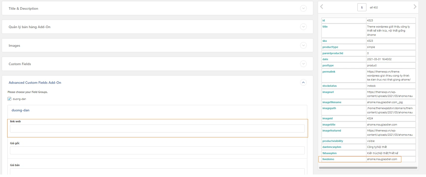 Bằng cách click vào phần Advanced Custom Fields Add – On chọn đường dẫn, tức là Theme ở ví dụ này được thiết kế dùng thêm ACF để tạo trường tùy chỉnh là link web để hiển thị link demo